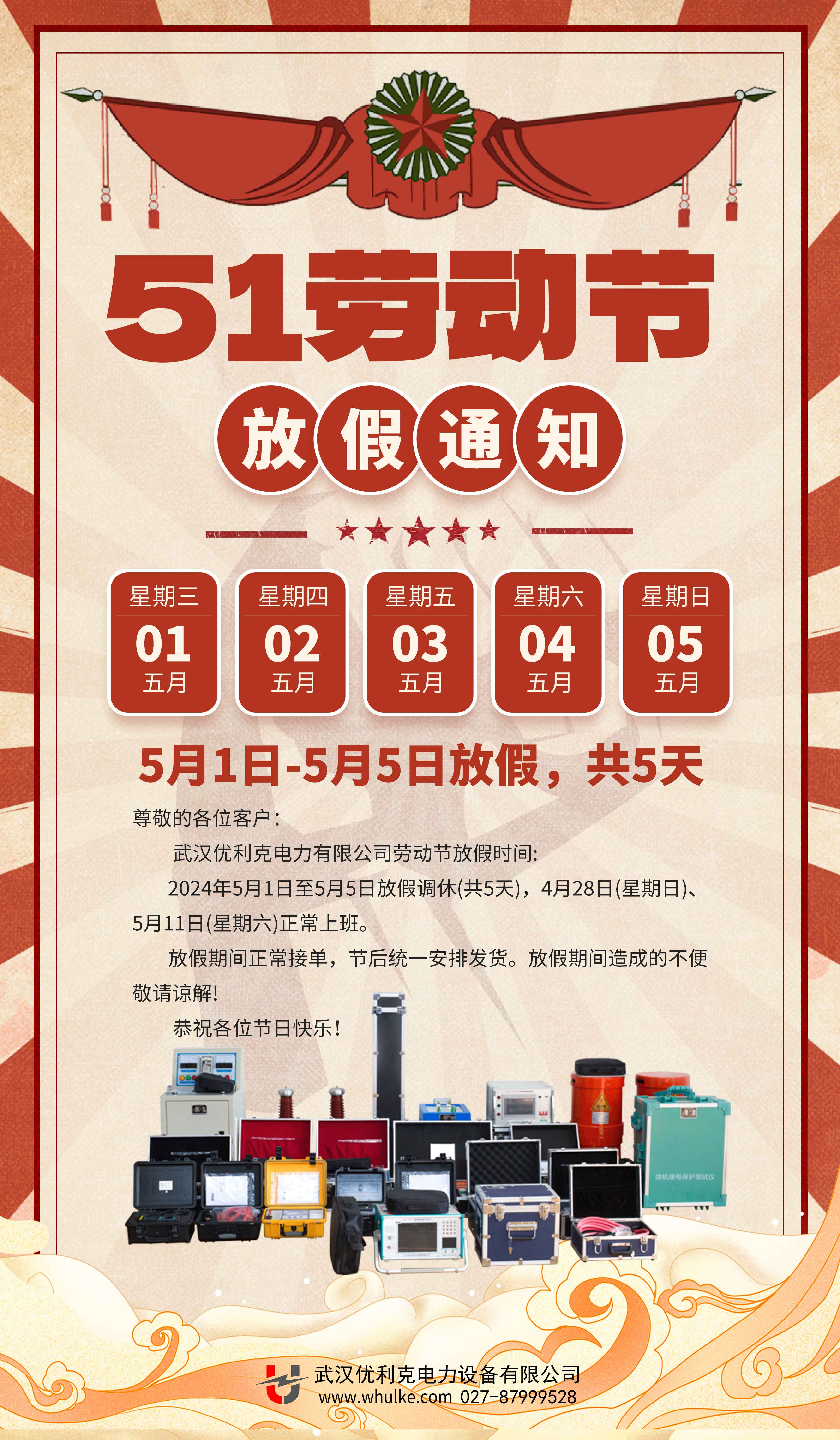 值五一勞動節來臨之際,根據國家法定假期規定,結合我公司實際情況,現將2024年五一勞動節放假事項通知如下: