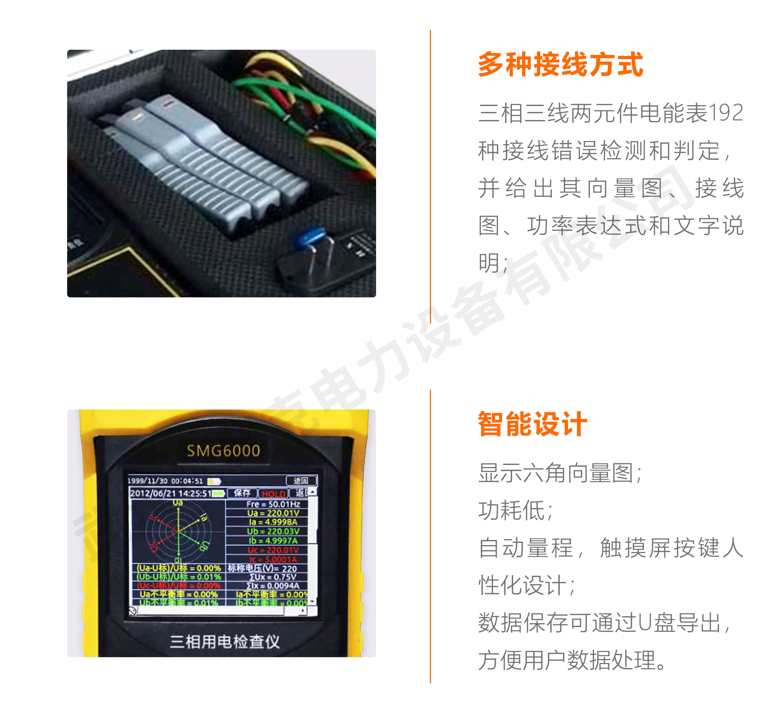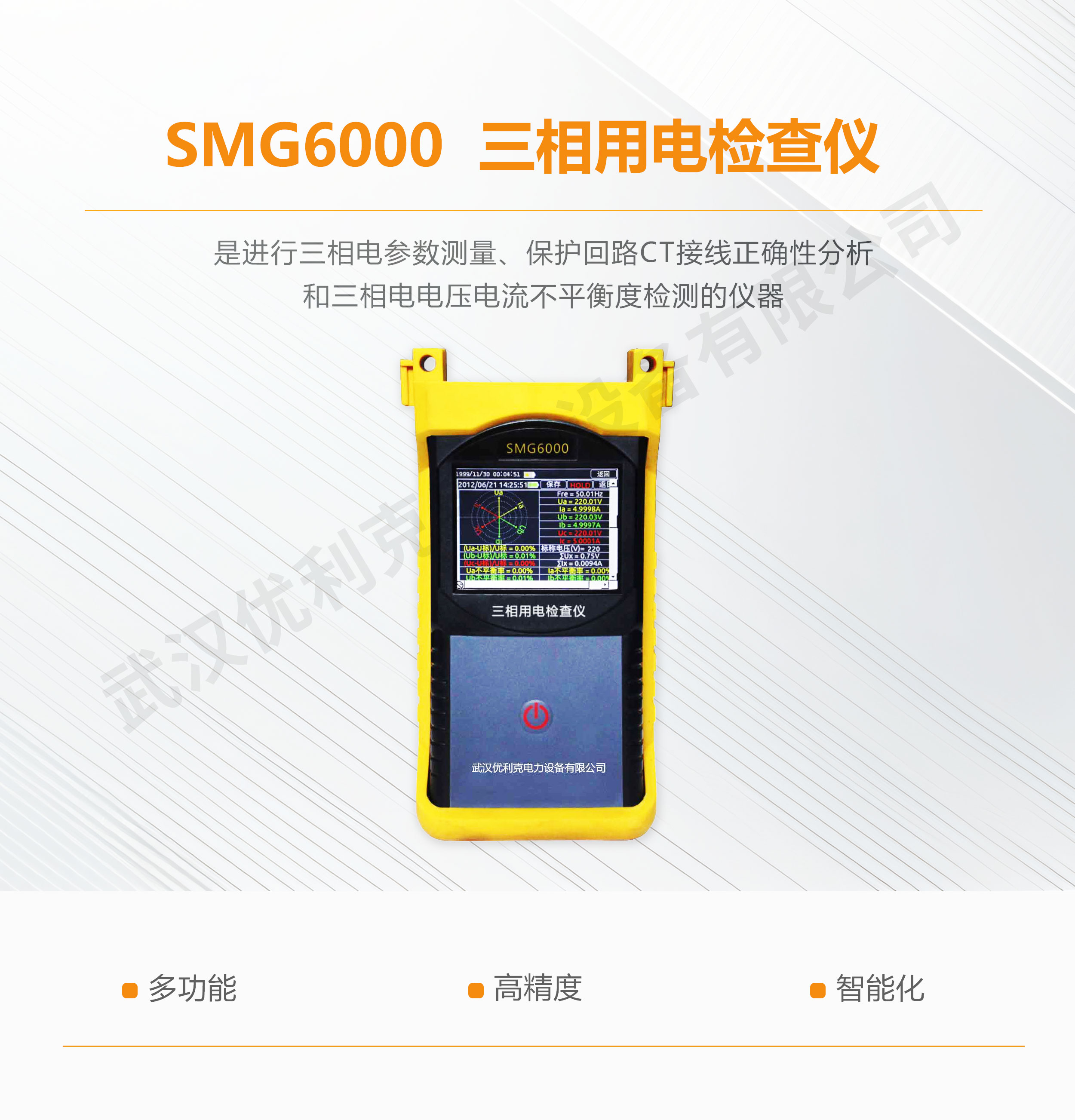 SMG6000三相用電檢查儀是進行三相電參數測量、保護回路CT接線正確性分析和三相電電壓電流不平衡度檢測的儀器,可以完成三相的電壓、電流、相角、頻率、功率、功率因數等電參數的高精度測量,更為獨特的是,能分析CT接線的正確性檢查電力線用電平衡情況。并具有電能計算功能。