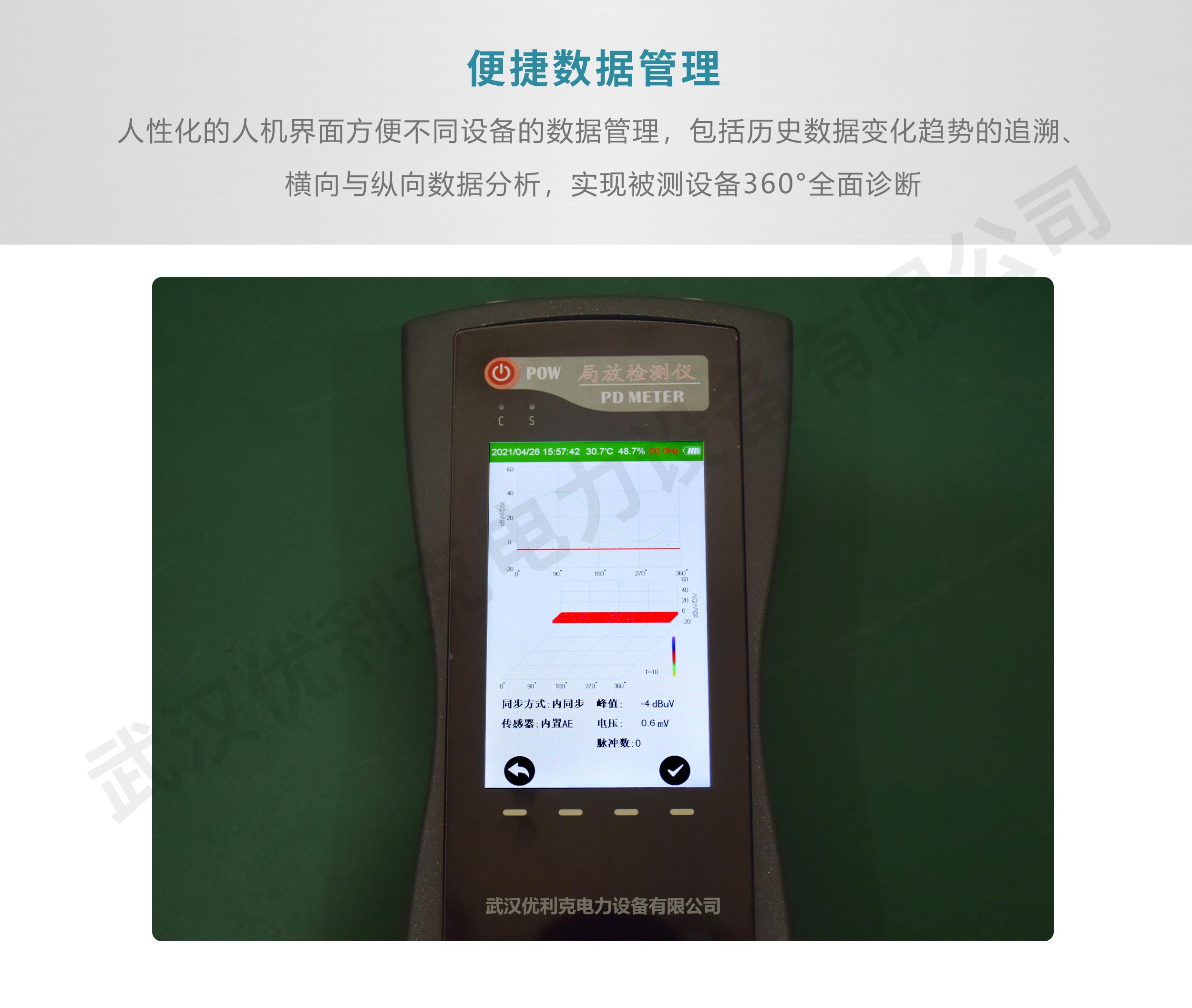 可以提供二維、三維圖譜的存儲以及讀出功能等,彩屏LCD顯示,不同顏色燈指示檢測結果,可以方便、快速評估電氣設備局部放電情況。