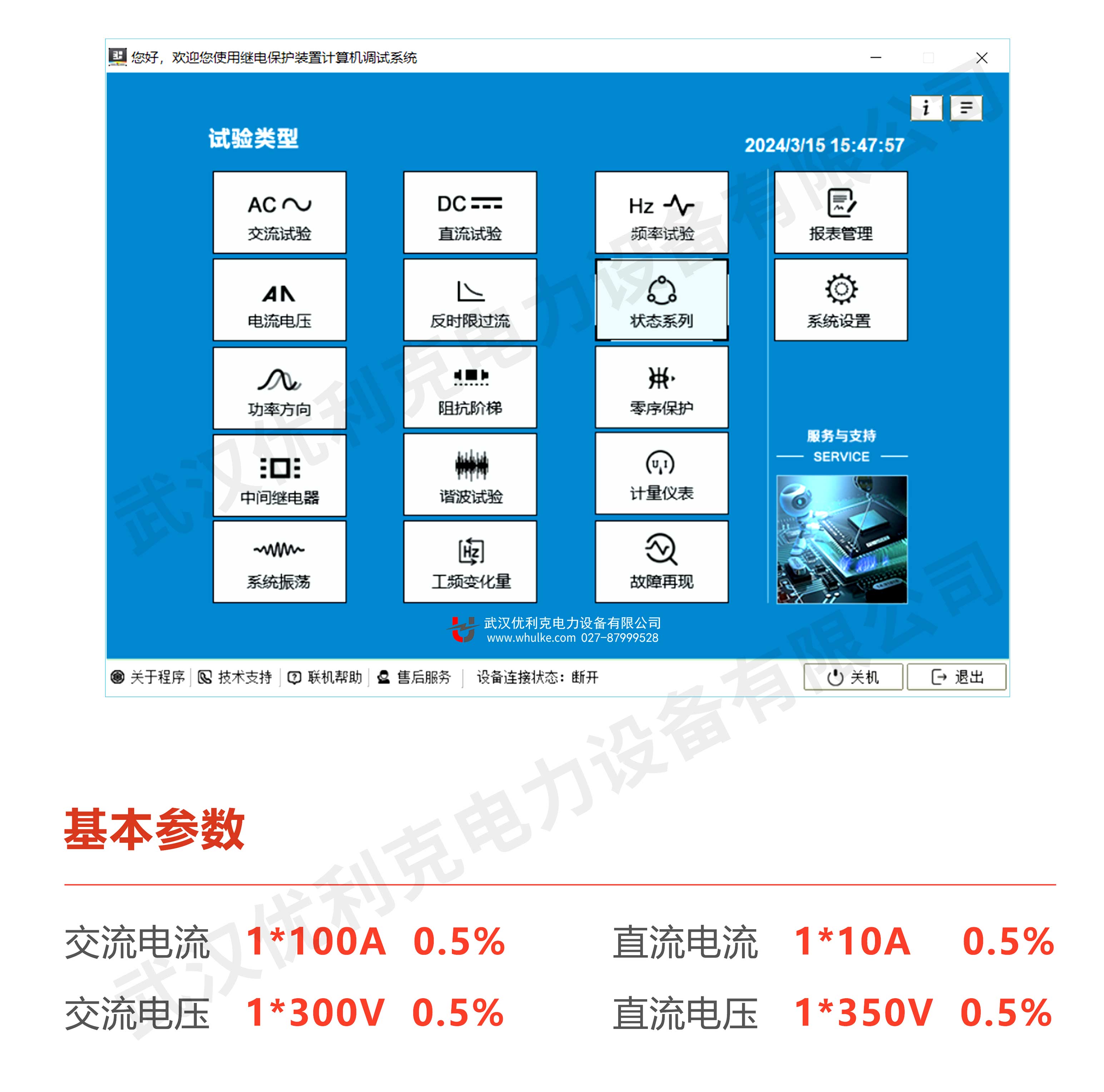 本儀器具有單相電壓,單相電流輸出,既可對傳統的各種繼電器及保護裝置進行試驗,也可對現代各種微機保護進行各種試驗。主控板采用DSP+FPGA結構,16位DAC輸出,對基波可產生每周2000點的高密度正弦波,大大改善了波形的質量,提高了測試儀的精度。功放采用高保真線性功放,既保證了小電流的精度,又保證了大電流的穩定。USB接口直接和PC機通訊,無須任何轉接線,方便使用。
