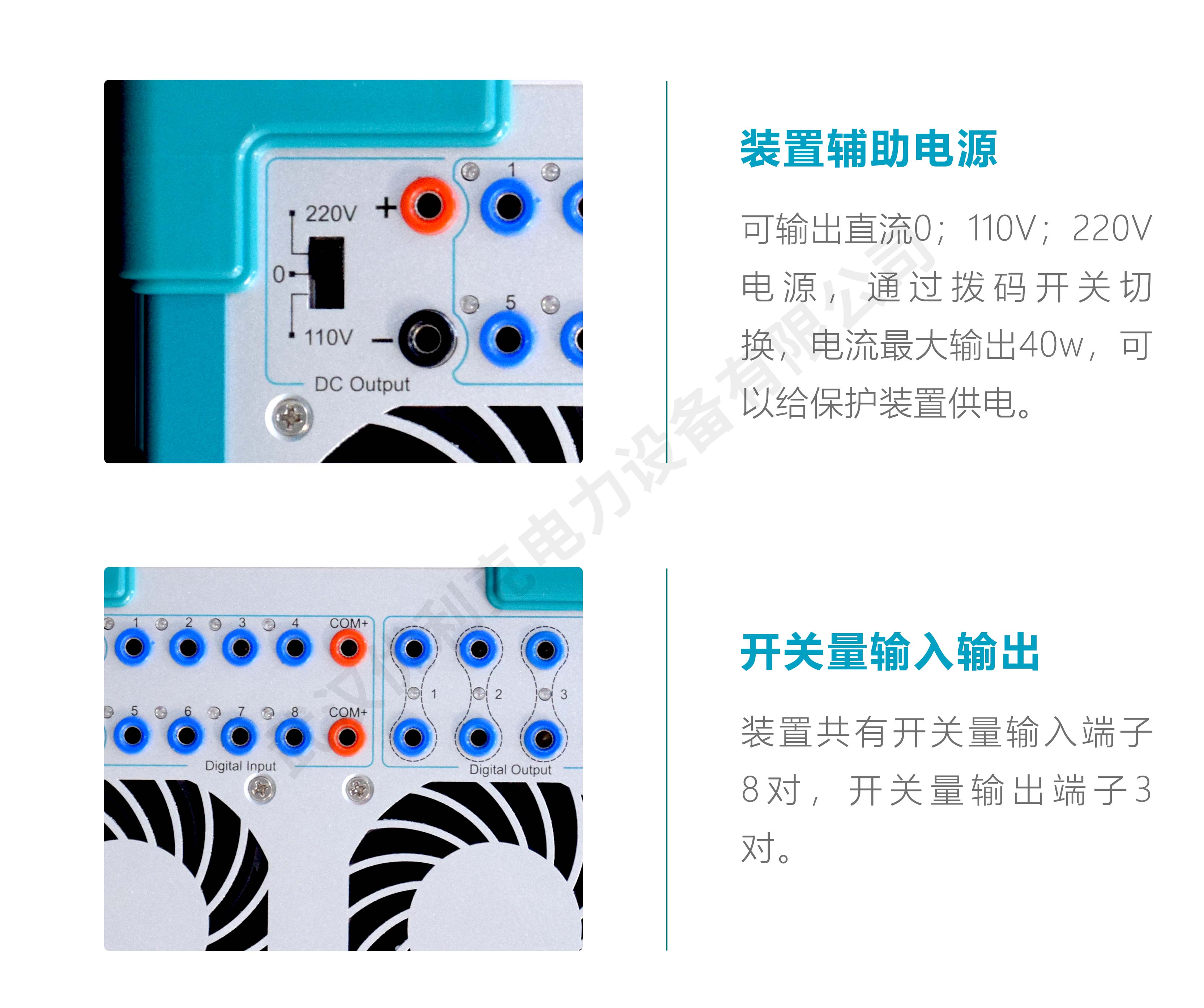 11、配有獨立專用直流輔助電壓源輸出,輸出電壓分別為110V(1A),220V(0.6A)。以提供給需要直流工作電源的繼電器或保護裝置使用。