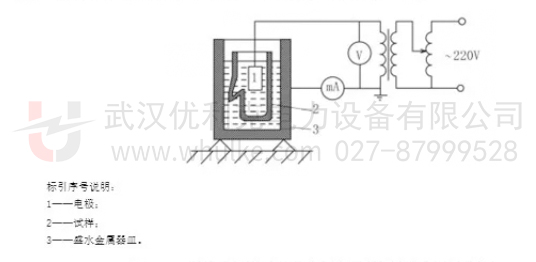 輔助型絕緣手套:將輔助型絕緣手套浸入盛有自來水的金屬器皿中,保持手套內(nèi)外水平面高度相同,套口邊緣露出水面 90mm±13mm 并擦干,逐漸升壓至表 27 規(guī)定值,保持規(guī)定時間,并測量泄漏電流,試驗接線見下圖。