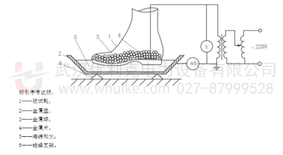 輔助型絕緣靴:外觀應(yīng)完好無損,鞋幫不應(yīng)開膠,鞋底防滑齒不應(yīng)磨平、外底不應(yīng)磨透露出絕緣層等。試驗應(yīng)無擊穿、閃絡(luò)現(xiàn)象,且泄漏電流不超過規(guī)定值,按 GB 21148 的規(guī)定進(jìn)行,試驗接線見下圖 。